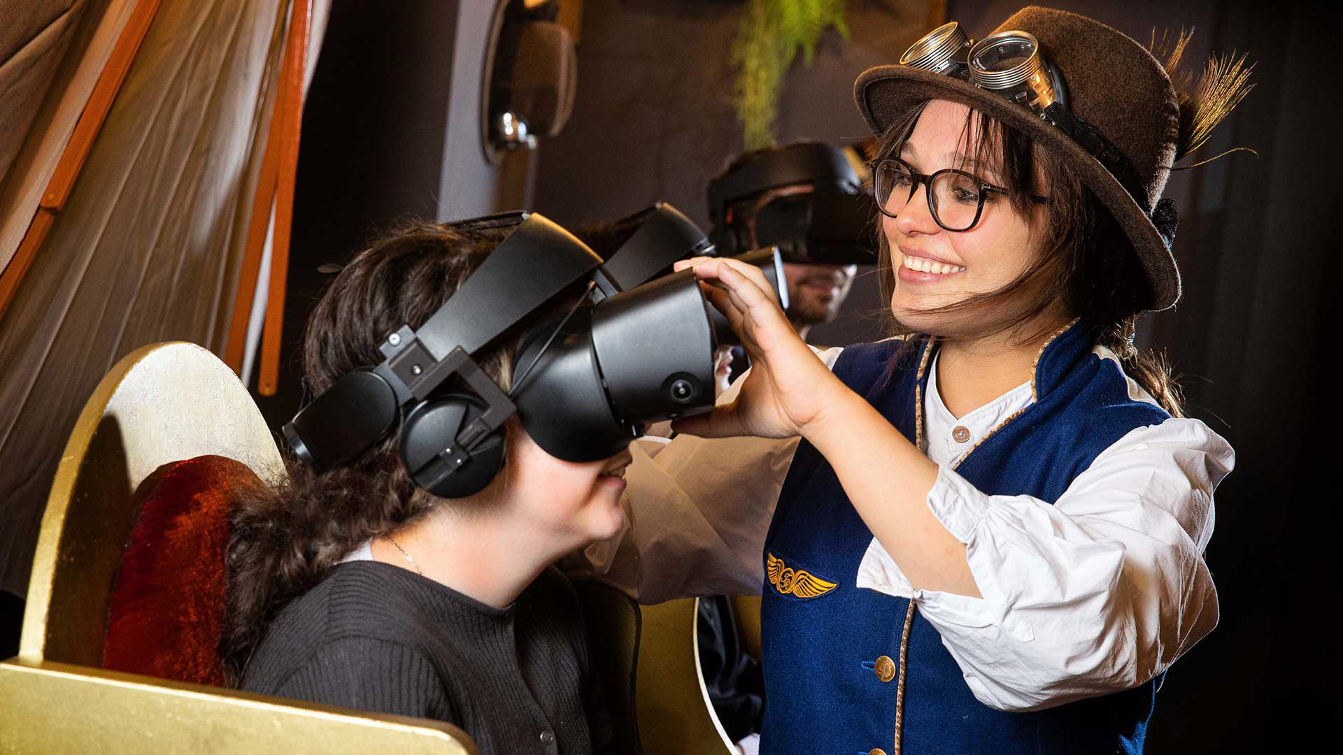 Fahrgäste mit VR-Brillen in historischer Straßenbahn, Schaffner tippt an Mütze, Senseum Köln